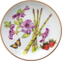 Julie Wear gathers ordinary fruits and vegetables from the garden and combines them together in unexpected ways to create a pattern of delightful color and movement. You will find luscious melon, plump eggplant, sassy radishes, peapods, some of which have lost their peas, served up with cheerful strawberries, ripe blueberries and blackberries. On one salad plate Wear has gathered a beautiful tulip and paired it with green onions and an apple slice. Another salad plate features asparagus lying on petunias; a slice of melon paired with a blackberry branch and an iris with a lush pear are shown together on the other two salad plates. Butterflies and honey bees, even a small snail, all make their appearances throughout the collection. A wonderful celery bunch makes it’s bold presence known on the striking platter with petunias along side a tulip and melon slice. The wonderful serve plate with a ripe melon resting on it’s leaves looks good enough to eat!