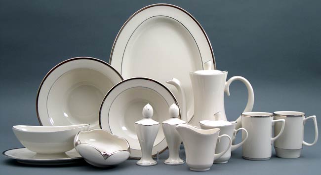 Description of pattern: The classic simplicity of elegant platinum bands; has a versatile mix-and-match tulip bowl. Pictured with Constellation Silver accent salad plate.