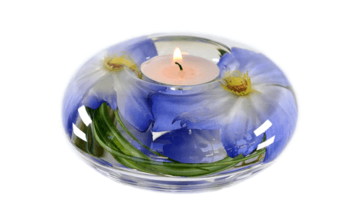 Glass t-light candle holder filled with faux light blue cosmos, green grass, and Emilio Robba’s exclusive Illusion Water.