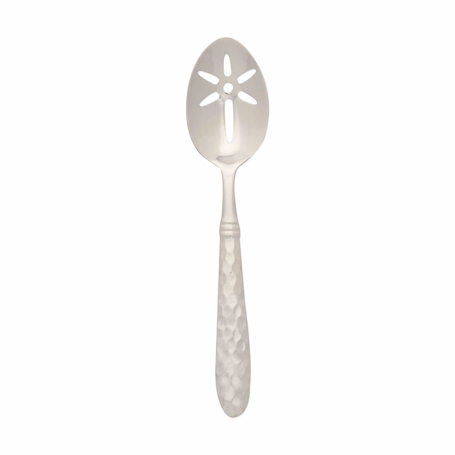 Italian artisans forge the Martellato Slotted Serving Spoon thus adding hammered detail. The 18/10 stainless steel combined with years of craftsmanship result in a well-balanced, weighty flatware. This hammered flatware set is made in Lumezzane, Italy, by the Bugatti family.