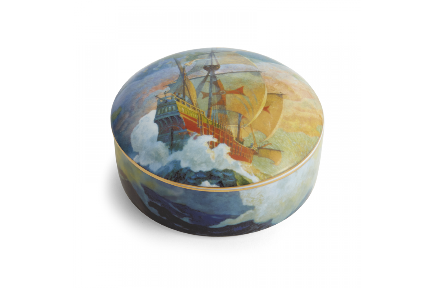 his colorful round box is an adaptation of an N.S. Wyeth painting in the series, Age of Discovery, circa 1926, showing Columbus Caravel Ship sailing toward the discovery of America. It was commissioned by the National Geographic Society and exhibited in the Washington, D.C. headquarters..