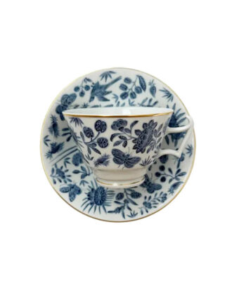 The design of the elegant teacup is colorful and the handle is unique. Licensed Product of Historic Charleston Foundation. Our new version has not been seen before. The Sacred Bird and Butterfly was a Chinese export pattern of about 1800 and was intended for those who admired the sophistication of placing traditional Chinese motifs of birds, butterflies and flowers on European shapes. The Chinese word for butterfly, tieh, is a pun which expresses the wish that the owner might live to a ripe age. These motifs were rendered with characteristic understatement in the traditional Chinese orange and gold colors in an all-over pattern.Today we offer it in Blue with silver luster and banded in gold. The marriage of shape and design was a success and was reproduced in English china of about 1800-1810. Our reproductions are based on originals in Historic Charleston. Dishwasher safe.