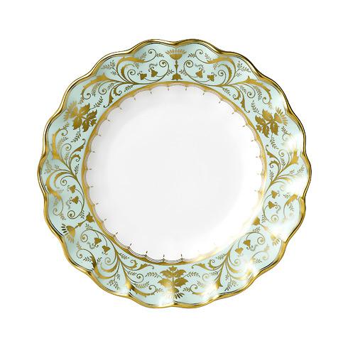 Darley Abbey captures the regency style of restrained simplicity using delicate lines and intricate curves representing twirling foliage and filigree leaves. The carefully placed ornamental elements combined with the gold glistening against the soft green silk damask background makes the pattern dance around the tableware.