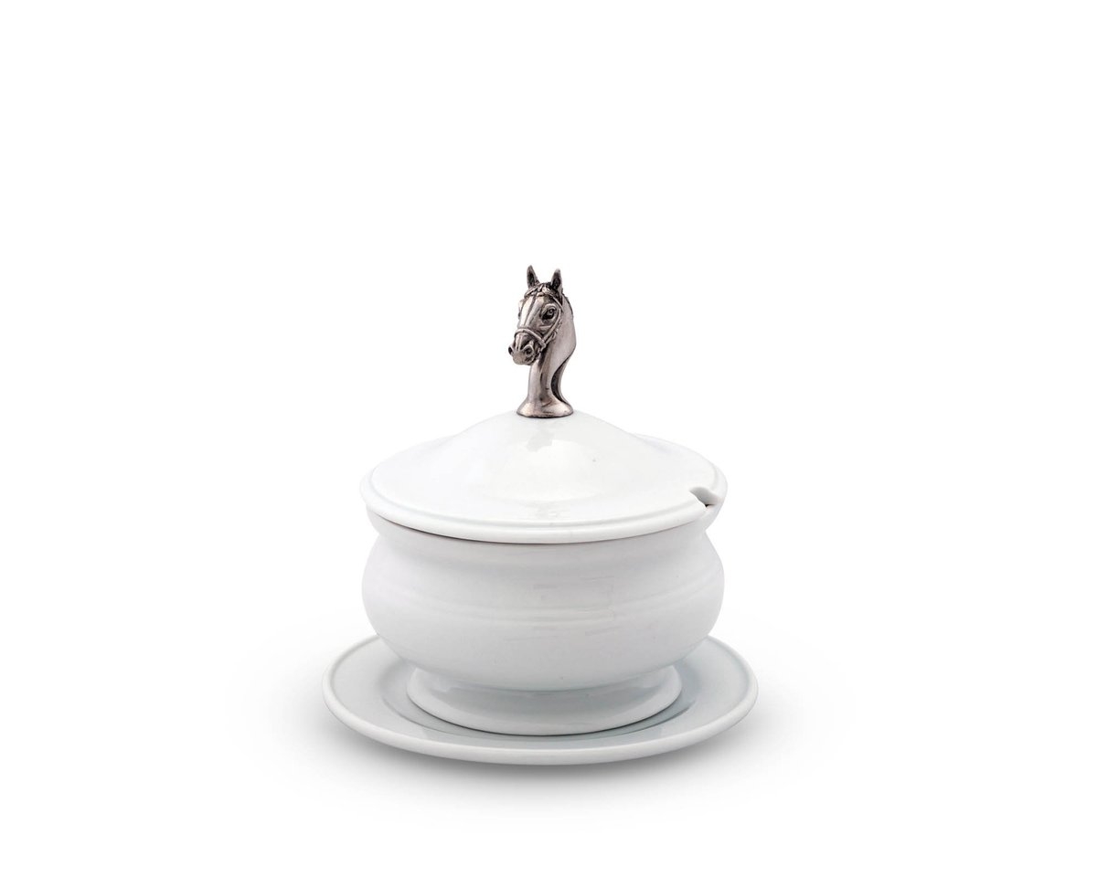 Beautiful stoneware bowl, twice-fired and double glazed to a lustrous snowy-white shine. Perfect for all kinds of sauces, gravy’s and soups, Vagabond House’s bowl comes with a matching lid, beautifully embellished with a elegnat Thoroughbred’s head, hand-crafted from solid an lead-free pewter. A table ware classic that will add an equestrian touch to your dinning table and that will start a conversation.