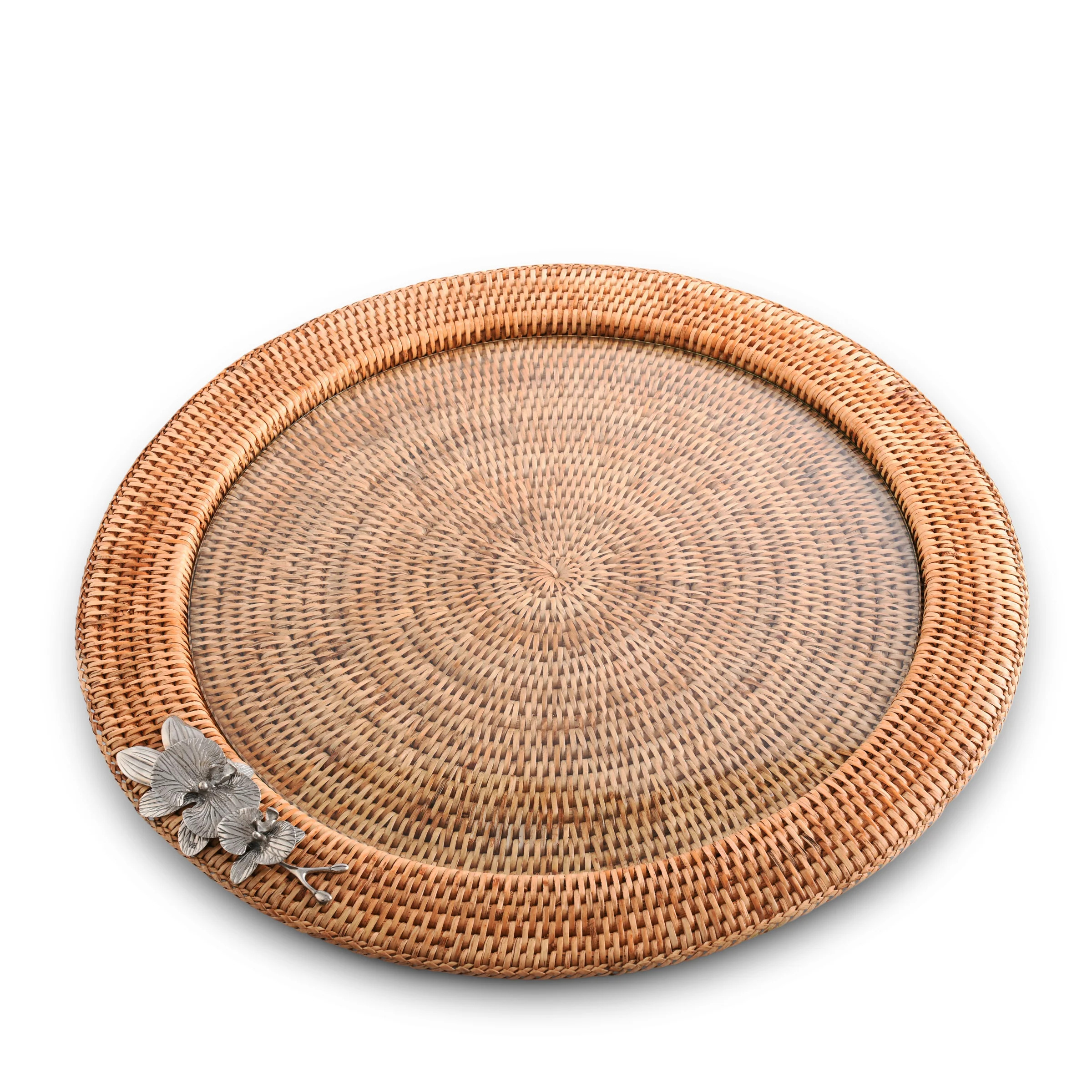 Elevate your serving experience with this exquisitely handwoven round wicker tray, a perfect blend of functionality and style. Its 17-inch diameter offers ample space, ideal for various uses from coffee table organization to an elegant ottoman tray. The intricate weaving, showcasing a harmonious blend of natural materials, adds a touch of rustic charm to your home decor. This tray features a unique glass insert, adorned with a delicate orchid design, which not only enhances its aesthetic appeal but also offers a smooth, easy-to-clean surface for serving. The sturdy handles ensure comfortable and secure transport of beverages, snacks, or decorative items. The circular shape and natural color palette make it a versatile addition to any interior style, from traditional to contemporary. Crafted with attention to detail, this decorative basket tray is more than just a functional item; it’s a statement piece that reflects your appreciation for artisanal quality. Whether used for serving guests or as a permanent fixture on your coffee table, it brings an element of natural beauty and practicality to your everyday life. Add this woven wonder to your collection, and enjoy the perfect combination of elegance and utility