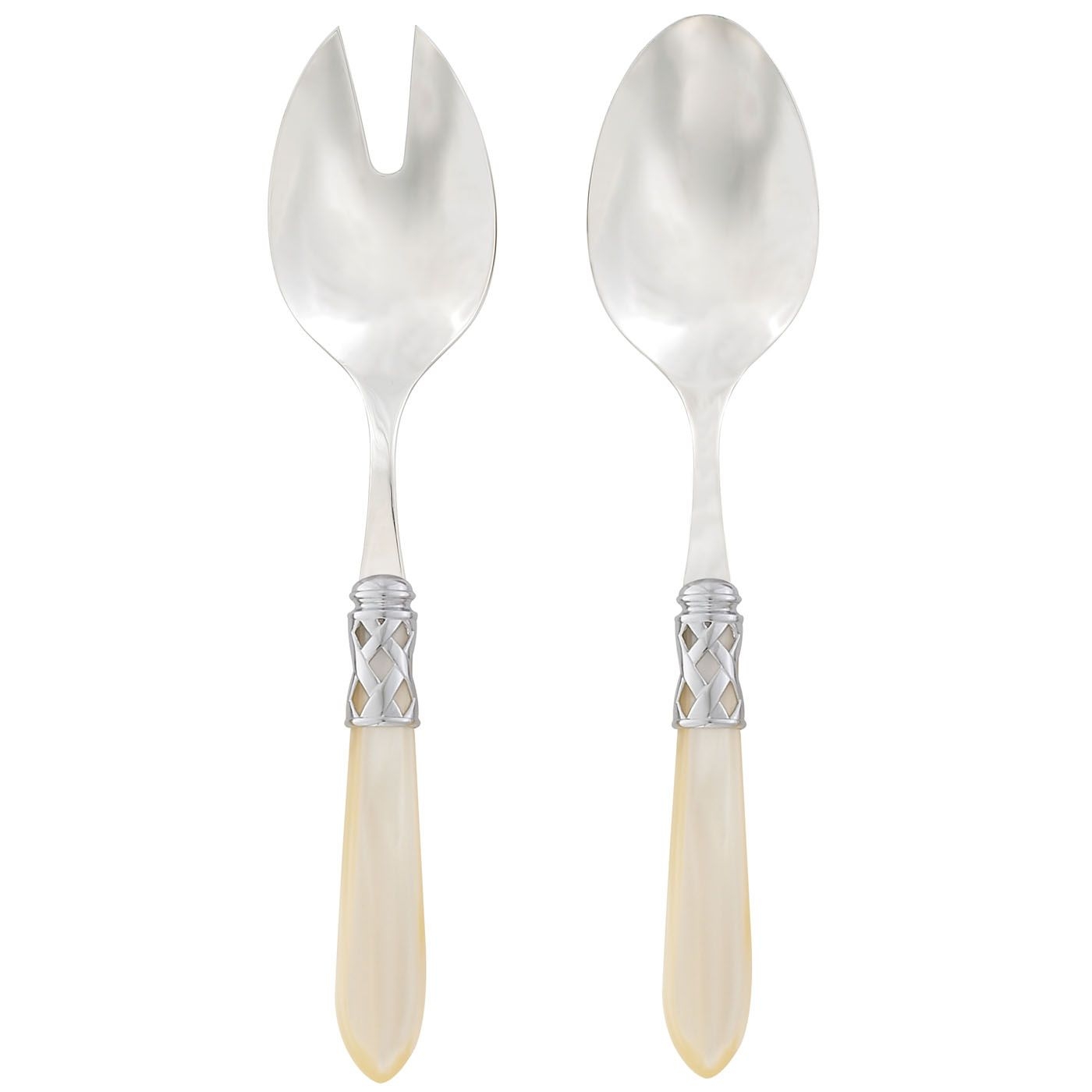 The Aladdin Brilliant Salad Server Set in ivory features elegant pearlized handles, with the strength of high-grade acrylic and 18/10 stainless steel.