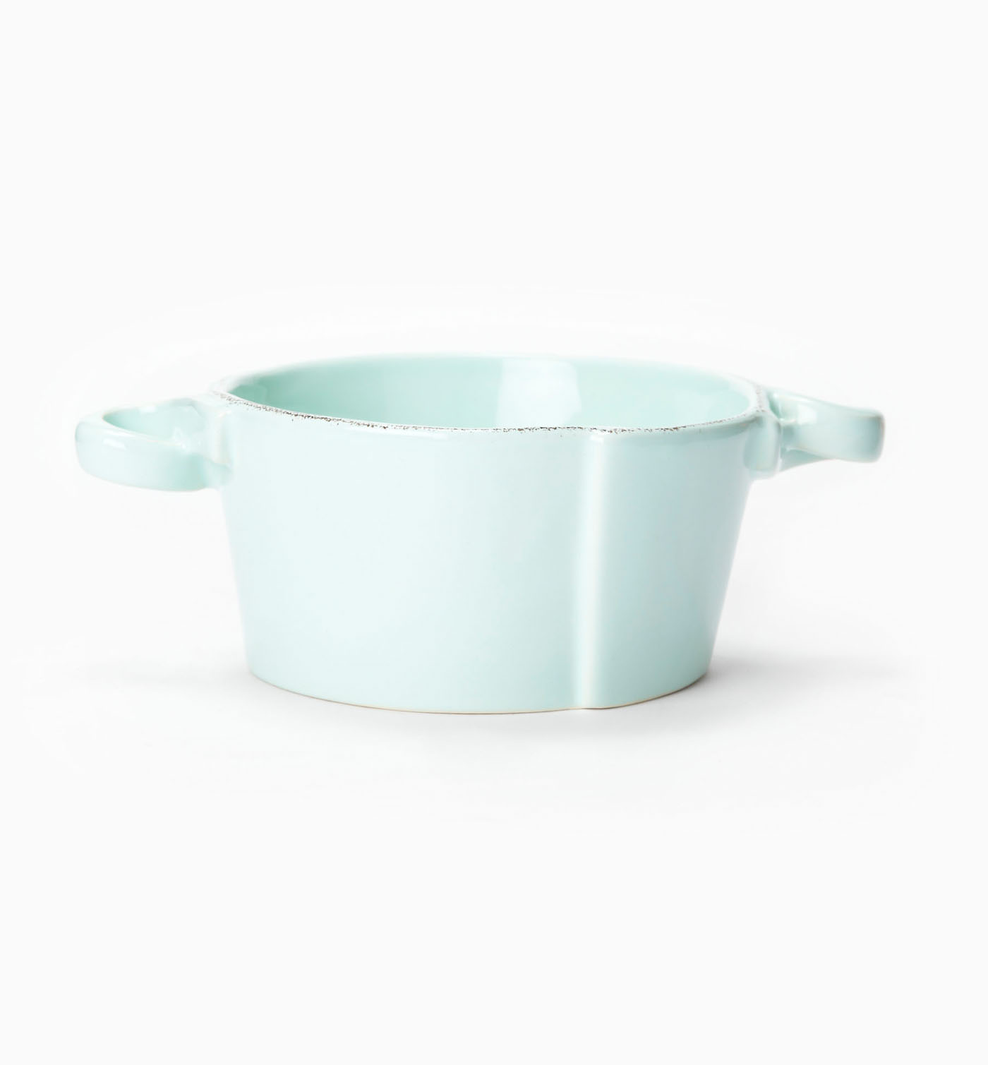Our long-awaited Lastra Aqua has arrived. The rustic yet chic shape of the small handled bowl looks clean and sophisticated on your table. Handformed in Tuscany of Italian stoneware. Microwave, oven, freezer, and dishwasher safe